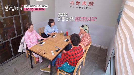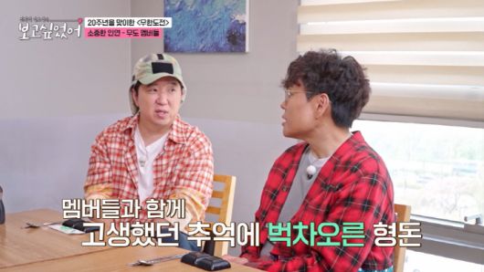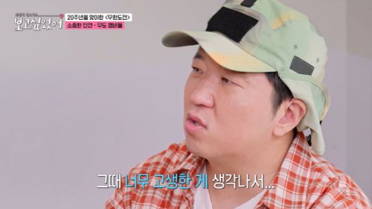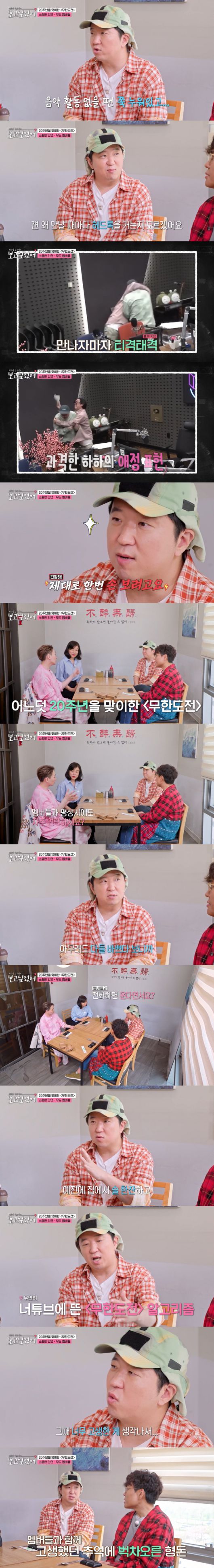 최화정은 "멤버들과 전화하면 운다더라"고 하자, 정형돈은 "예전에 집에서 술 한잔하고, 유튜브에 '무한도전' 알고리즘이 뜬다. 그때 고생한 게 생각이 난다"며 멤버들과 함께 고생했던 추억에 벅차 올랐던 순간을 떠올렸다.