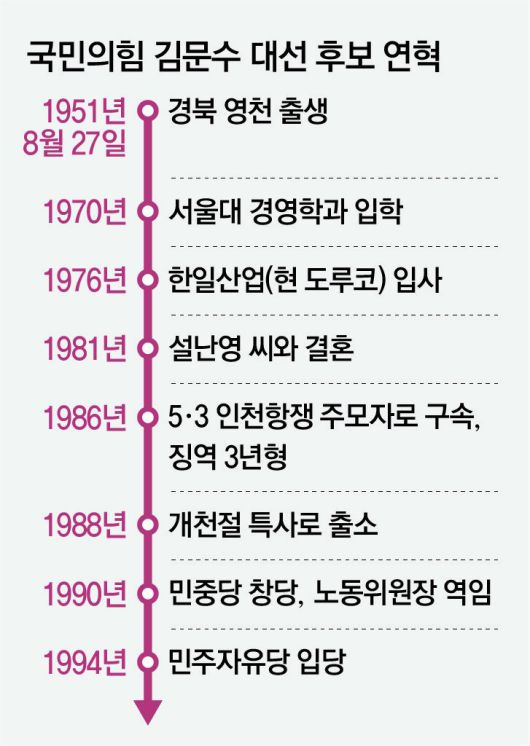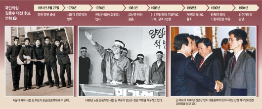 김 후보는 2년 뒤인 1994년 3월 “지금 여당이 개혁을 잘하고 있고 가장 개혁적인 정치인이 김영삼 대통령”이라며 당시 여당인 민주자유당에 전격 입당한다. 김 후보의 서울대 은사인 안병직 명예교수는 “우리가 운동할 때 가졌던 휴머니즘을 현실에 제대로 접목해 실현할 방법을 찾아야 할 것”이라며 입당에 찬성했다고 한다.