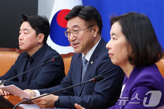 (서울=뉴스1) 안은나 기자 = 윤호중 더불어민주당 총괄선거대책본부장이 5일 오전 서울 여의도 국회에서 열린 기자간담회에 참석해 모두 발언하고 있다. 왼쪽부터 강훈식 수석부본부장, 윤 본부장, 박경미 대변인. 2025.5.5/뉴스1coinlocker@news1.krCopyright ⓒ 뉴스1. All rights reserved. 무단 전재 및 재배포, AI학습 이용 금지.