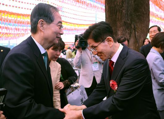 김문수 국민의힘 대선 후보와 한덕수 무소속 대선 예비후보가 5일 서울 종로구 조계사에서 열린 부처님오신날 봉축법요식에서 악수하고 있다. (대통령실통신사진기자단) 2025.05.05. 뉴시스 |