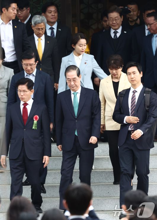 (서울=뉴스1) 김민지 기자 = 김문수 국민의힘 대통령 후보(앞줄 왼쪽)와 한덕수 무소속 대통령 선거 예비후보가 5일 오전 서울 종로구 조계사에서 열린 불기 2569년 부처님오신날 봉축법요식에 참석하고 있다. 뒷편은 이재명 더불어민주당 대통령 후보. 2025.5.5/뉴스1