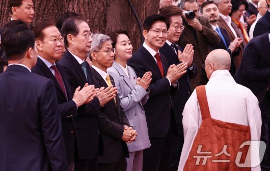 (서울=뉴스1) 김민지 기자 = 이재명 더불어민주당 대통령 후보(오른쪽부터)와 김문수 국민의힘 대통령 후보, 한덕수 무소속 대통령 선거 예비 후보(왼쪽 세번째)가 5일 오전 서울 종로구 조계사에서 열린 불기 2569년 부처님오신날 봉축법요식에 참석해 합장하고 있다. 2025.5.5/뉴스1