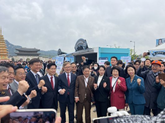아시아투데이 정채현 기자 = 김문수 국민의힘 대선 후보(왼쪽에서 다섯번째)가 5일 가족 동행 축제 '펀펀한 광화문광장'에 방문했다.