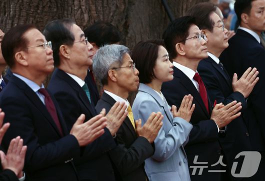 (서울=뉴스1) 김민지 기자 = 김문수 국민의힘 대통령 후보와 이재명 더불어민주당 대통령 후보가 5일 오전 서울 종로구 조계사에서 열린 불기 2569년 부처님오신날 봉축법요식에 참석해 합장하고 있다. 왼쪽 두번째는 한덕수 무소속 대통령 선거 예비후보. 2025.5.5/뉴스1