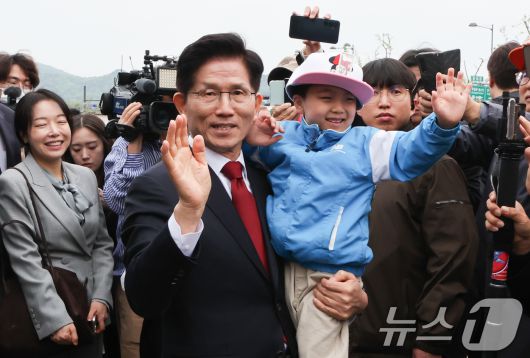 (서울=뉴스1) 허경 기자 = 김문수 국민의힘 대통령 후보가 5일 서울 종로구 광화문광장육조마당에서 열린 가족 동행 축제 '펀펀한 광화문광장'을 방문해 어린이를 안아주고 있다. 2025.5.5/뉴스1