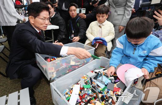 (서울=뉴스1) 허경 기자 = 김문수 국민의힘 대통령 후보가 5일 서울 종로구 광화문광장육조마당에서 열린 가족 동행 축제 '펀펀한 광화문광장'을 방문해 어린이들과 블럭 모자를 만들고 있다. 2025.5.5/뉴스1