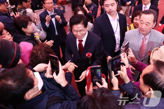(서울=뉴스1) 김민지 기자 = 김문수 국민의힘 대통령 후보가 5일 오전 서울 종로구 조계사에서 열린 불기 2569년 부처님오신날 봉축법요식을 마치고 지지자들과 인사하고 있다. 2025.5.5/뉴스1