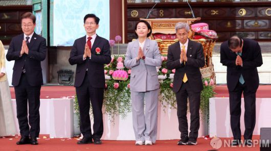 [서울=뉴스핌] 정일구 기자 = 이재명 더불어민주당 대선 후보(왼쪽부터), 김문수 국민의힘 대선 후보, 김재연 진보당 대선 후보, 권영국 정의당 대선 후보, 한덕수 무소속 대선 예비후보가 5일 오전 서울 종로구 조계사에서 열린 불기 2569년 부처님오신날 봉축법요식에서 헌화한 뒤 합장하고 있다. 2025.05.05 mironj19@newspim.com