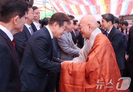 (서울=뉴스1) 김민지 기자 = 이재명 더불어민주당 대통령 후보가 5일 서울 종로구 조계사에서 열린 불기 2569년 부처님오신날 봉축법요식에 참석, 조계종 총무원장 진우스님과 인사하고 있다. (조계종 제공. 재판매 및 DB 금지) 2025.5.5/뉴스1kimkim@news1.krCopyright ⓒ 뉴스1. All rights reserved. 무단 전재 및 재배포, AI학습 이용 금지.