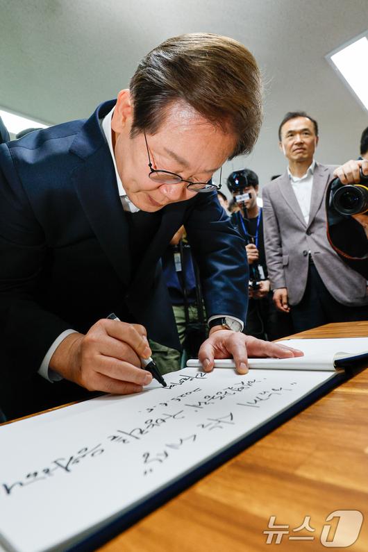 (여주=뉴스1) 안은나 기자 = 이재명 더불어민주당 대통령 후보가 2차 골목골목 경청투어에 나선 5일 오후 경기 여주시 구양리 마을회관을 찾아 방명록을 적고 있다. '함께사는 세상 햇볓공동체 구양리를 응원합니다'라고 적었다. 2025.5.5/뉴스1coinlocker@news1.krCopyright ⓒ 뉴스1. All rights reserved. 무단 전재 및 재배포, AI학습 이용 금지.