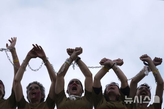 [텔아비브=AP/뉴시스] 21일(현지 시간) 이스라엘 텔아비브에서 가짜 피 등으로 분장한 활동가들이 서로의 손을 사슬로 묶은 채 2023년 10월 7일 키부츠 나할 오즈에서 하마스 무장 세력에 납치된 이스라엘 병사 마탄 앙그레스트의 석방을 촉구하고 있다. 2025.04.22. |