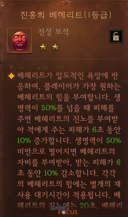 학살의 전당에서 진행이 가능한 ‘사도의 도전’은 베르세르크의 인기 캐릭터 ‘노스페라투 조드’와 직접 전투를 즐길 수 있다. 최초 1회 전투로 전설 보석인 ‘진홍의 베헤리트’를 얻을 수 있다. 진홍의 베헤리트는 장착 캐릭터의 HP가 높으면 대미지를 증가시키는 ‘베헤리트의 분노’ 버프를, HP가 낮을 경우 받는 피해를 주는 ‘베헤리트의 자비’ 버프를 제공한다. 단순한 능력치만 비교한다면 기존의 보석들보다 크게 좋다, 나쁘다라고 평가할 수는 없지만 각각의 효과가 별개의 재사용 시간을 가지는 만큼 사냥의 안전성에서 많은 이점을 가지게 되니 꼭 획득하도록 하자.