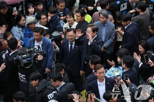 (음성=뉴스1) 안은나 기자 = 이재명 더불어민주당 대통령 후보가 2차 골목골목 경청투어에 나선 5일 오후 충북 음성군 무극시장을 찾아 즉흥 연설하고 있다. 2025.5.5/뉴스1
