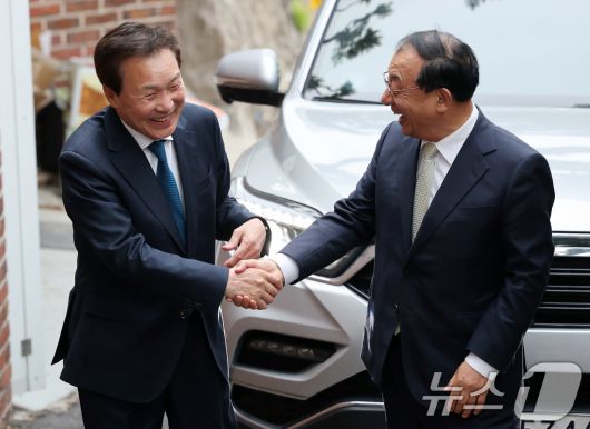 (서울=뉴스1) 박세연 기자 = 손학규 전 민주당 대표가 5일 한덕수 무소속 대통령 선거 예비 후보와 만찬 회동을 갖기위해 서울 종로구 한 식당으로 들어서며 이정현 한덕수캠프 대변인과 인사를 나누고 있다. 2025.5.5/뉴스1psy5179@news1.krCopyright ⓒ 뉴스1. All rights reserved. 무단 전재 및 재배포, AI학습 이용 금지.