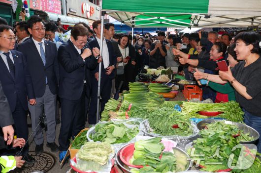(음성=뉴스1) 안은나 기자 = 이재명 더불어민주당 대통령 후보가 2차 골목골목 경청투어에 나선 5일 오후 충북 음성군 무극시장을 찾아 상인들을 격려하고 있다. 2025.5.5/뉴스1coinlocker@news1.krCopyright ⓒ 뉴스1. All rights reserved. 무단 전재 및 재배포, AI학습 이용 금지.