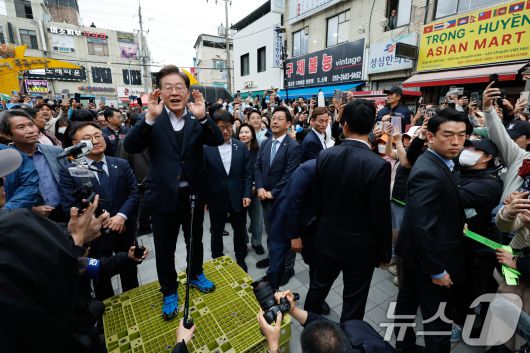 (음성=뉴스1) 안은나 기자 = 이재명 더불어민주당 대통령 후보가 2차 골목골목 경청투어에 나선 5일 오후 충북 음성군 무극시장을 찾아 즉흥 연설하고 있다. 2025.5.5/뉴스1