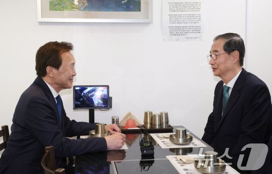 (서울=뉴스1) 박세연 기자 = 한덕수 무소속 대통령 선거 예비 후보와 손학규 전 민주당 대표가 5일 서울 종로구의 한 식당에서 만찬 회동을 갖고 있다. (공동취재) 2025.5.5/뉴스1