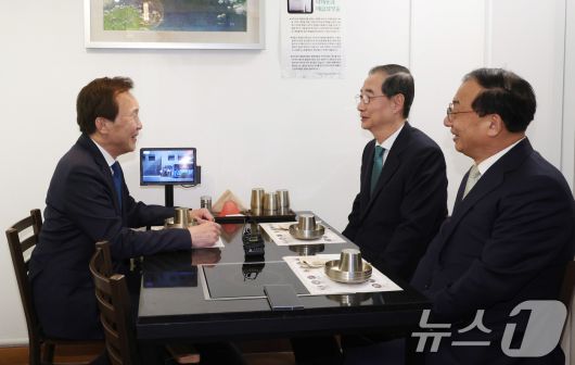 (서울=뉴스1) 박세연 기자 = 한덕수 무소속 대통령 선거 예비 후보와 손학규 전 민주당 대표가 5일 서울 종로구의 한 식당에서 만찬 회동을 갖고 있다. 왼쪽부터 손학규 전 대표, 한덕수 후보, 이정현 한덕수캠프 대변인. (공동취재) 2025.5.5/뉴스1