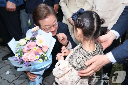 (진천=뉴스1) 안은나 기자 = 이재명 더불어민주당 대통령 후보가 2차 골목골목 경청투어에 나선 5일 오후 충북 진천군의 혁신도시 상가를 찾아 한 어린이로부터 꽃다발을 선물받은 약속을 하고 있다. 2025.5.5/뉴스1coinlocker@news1.krCopyright ⓒ 뉴스1. All rights reserved. 무단 전재 및 재배포, AI학습 이용 금지.