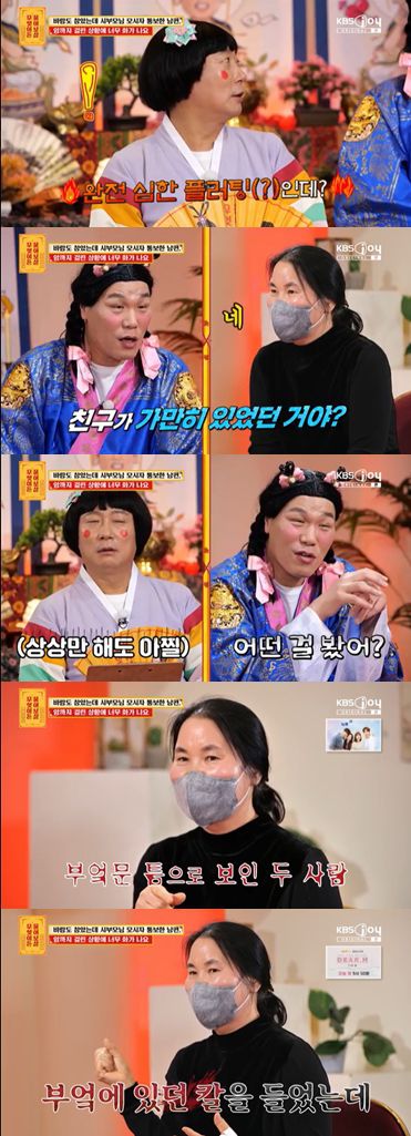 사연자는 "방이 3개가 있었는데 부엌 딸린 방에서 잠을 자게 됐다. 친구가 결혼식에 같이 가자고 3~4일 동안 머물다가 결혼식에 가게 됐다. 둘째 날에 친구가 속옷을 안 입고 치마만 입고 돌아다니더라"라며 당시를 떠올렸다.