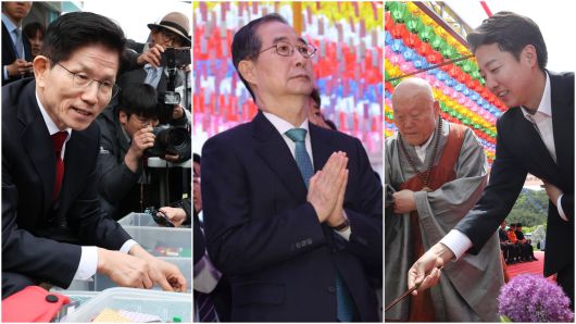 김문수 국민의힘 대선 후보, 한덕수 무소속 대선 예비 후보, 이준석 개혁신당 대선 후보는 어린이날이자 부처님오신날인 5일에도 범보수 진영 단일화론에 대한 입장 차를 좁히지 못한 채 각자 일정을 소화했다. 한 후보는 이날 서울 종로구 조계사 봉축법요식에서 만난 김 후보에게 “오늘 중 만나자”고 제안했지만, 김 후보는 “곧 다시 만나자”고만 답하면서 단일화 논의를 위한 회동 일정은 잡히지 않았다. 이런 가운데 대선 완주 입장을 고수하는 이 후보는 “단일화 논의에서 빠지고 싶다”며 조계사 대신 대구 동화사를 찾았다.