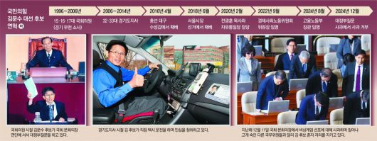 도지사 이후 김 후보의 정치 인생은 순탄치 않았다. 2012년엔 대선 경선에 출마했으나 박근혜 후보에게 크게 밀렸다. 2014년 3선 경기도지사 불출마를 선언한 뒤 당의 ‘험지 출마’ 요구에 2016년 대구 수성갑에 출마했으나 민주당 김부겸 후보에게 24.6%포인트 차로 졌다. 박근혜 전 대통령 탄핵 이후 치러진 2018년 서울시장 선거에 후보로 나섰지만 패배했다.