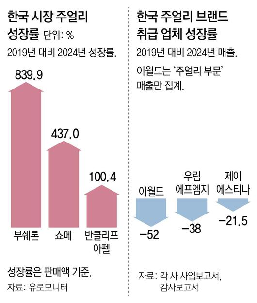 반면 초고가 럭셔리 주얼리 브랜드의 성장은 매우 가팔랐다. 시장조사기관 유로모니터가 집계한 2019년 대비 2024년 판매액 성장률은 부쉐론이 839.9%로 가장 높았다. 부쉐론에서 웨딩 반지로 유명한 콰트로 클래식 스몰 링은 1090만 원에 달한다. 같은 기간 △쇼메(437%) △반클리프아펠(100.4%) △판도라(83.6%) △루이뷔통(75.2%) △불가리(69.9%) △까르띠에(66.2%) 등의 판매액 성장률이 한국 주얼리 시장 전체 성장률(49.9%)을 앞질렀다. 유로모니터 관계자는 “비교적 가격이 저렴한 외국산 브랜드 스와로브스키, DKNY 등도 하락세”라고 설명했다.