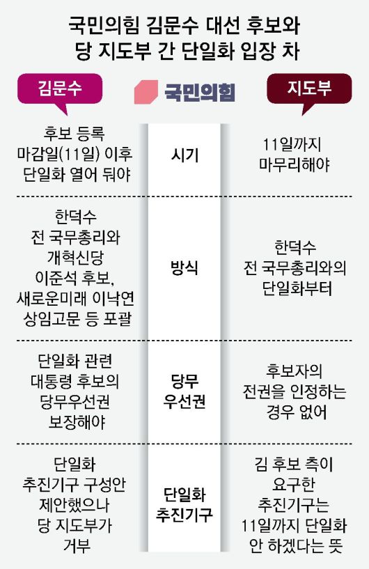 하지만 단일화 시기를 두고 김 후보와 당 지도부가 큰 간극을 보인 가운데 단일화를 둘러싼 갈등이 계속 이어질 수 있다는 관측이 나온다. 국민의힘 신동욱 수석대변인은 기자들과 만나 단일화 시기 등에 대해선 “결정난 것이 없다. 가능한 한 이른 시간 안에 일정에 대해서도 결론 내려지길 기대한다”고 밝혔다. 단일화 시기와 방식에 합의점을 찾지 못한 만큼 갈등의 불씨가 그대로 남은 셈이다.