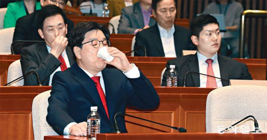 국민의힘 권성동 원내대표(앞줄 왼쪽)가 5일 오후 국회에서 열린 국민의힘 김문수 대선 후보와 한덕수 전 국무총리의 단일화 논의를 위한 의원총회에서 물을 마시고 있다. 권 원내대표는 의총에서 “선거에 아름다운 패배란 존재하지 않는다”며 “승리를 위한 단일화의 길을 가야 한다”고 말했다. 변영욱 기자 cut@donga.com |