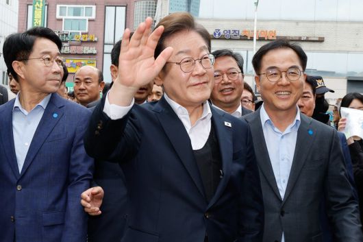 이재명 더불어민주당 대통령 후보가 2차 골목골목 경청투어에 나선 5일 오후 경기 양평군 양평시장을 찾아 인사하고 있다. 2025.5.5 뉴스1 |