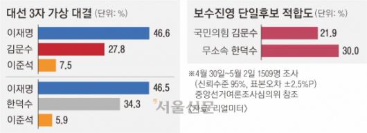 한 전 총리는 애초 단일화 승리 후 국민의힘의 지원을 받는 대선 레이스를 염두에 뒀다. 이에 현재의 소규모 캠프만으로는 독자적인 일정을 수행하는 데 한계가 있는 것으로 전해진다. 단일화에 매몰되면서 한 전 총리가 외교통상 전문가로서의 경쟁력을 부각하지 못하고 있다는 우려도 커진다. 공식 출마 선언 당시 개헌 구상 외에는 별다른 공약도 내놓지 않고 있다. 리얼미터가 에너지경제신문 의뢰로 지난달 30일부터 지난 2일까지 진행한 차기 대선 보수진영 단일 후보 적합도 조사(95% 신뢰 수준에 표본 오차 ±2.5% 포인트, 중앙선거여론조사심의위 참조)를 보면 한 전 총리는 30.0%로 김 후보(21.9%)를 오차 범위 밖에서 앞선 것으로 나타났다.
