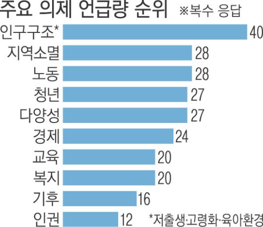 한국 사회가 관심을 가져야 할 문제에 대해서는 저출생·고령화를 꼽는 참여자가 많았다. 광장의 집회에서 다양성, 젠더, 기후, 노동, 안전 등 다양한 의제가 나왔지만 저출생은 상대적으로 언급이 적었던 점에 비춰보면 차이가 있다. 부산의 30대 남성 참여자는 “아이들이 우리의 미래인데 지금 너무 안 낳고 있다”고 말했다.