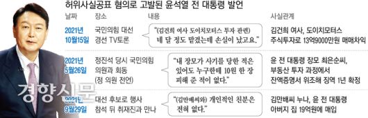 5일 법조계에 따르면 서울중앙지검 공공수사2부(부장검사 조민우)는 최근 윤 전 대통령의 선거법 위반 사건 고발인을 불러 조사하는 등 관련 수사에 착수했다. 윤 전 대통령은 국민의힘 대선 경선 후보 때였던 2021년 10월 한 TV토론에서 김건희 여사의 도이치모터스 주가조작 연루 의혹을 부인하며 “(김 여사가) 넉 달 정도 (투자를) 맡겼는데 손실이 났다”고 말했다가 선거법상 허위사실공표 혐의로 시민단체 등에 의해 고발당했다. 한국거래소가 검찰에 제출한 이상심리분석 결과 보고서에 따르면 김 여사는 이 투자로 13억9000만원의 매매차익을 본 것으로 나타났다.