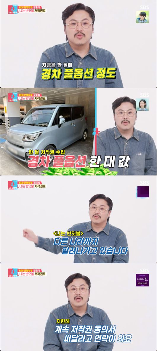 이를 들은 김숙은 저작권료로 한 달에 차 한 대씩을 살 수 있는 것이라며 놀라워 했고, 정중식은 “다른 나라까지 팔려나가고 있다. 계속 저작권 동의서 써달라고 연락이 온다”라며 남다른 인기를 설명했다.