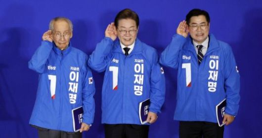 이재명 더불어민주당 대선 후보(가운데)가 지난달 30일 서울 여의도 국회 의원회관에서 열린 더불어민주당 제21대 대통령선거 '진짜 대한민국' 중앙선거대책위원회 출범식에서 윤여준·박찬대 상임총괄선대위원장과 국민의 목소리에 귀를 기울이겠다는 의미의 '경청 퍼포먼스'를 하고 있다. 김현민 기자 |