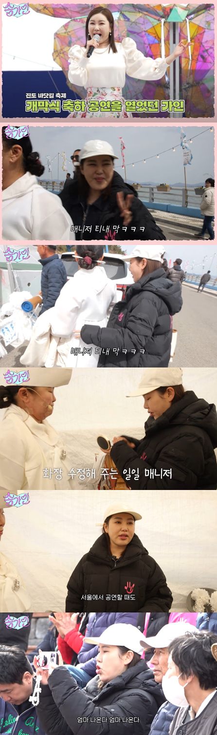 공연 장소에 도착한 송가인은 어머니의 지인들과도 인사를 나눴고, 화장을 수정해 주는 등 열심히 어머니를 돕는 모습을 보였다.