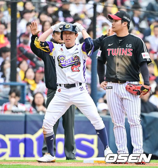 [OSEN=잠실, 박준형 기자]  5일 오후 서울 잠실구장에서 ‘2025 신한 SOL BANK KBO리그’ 두산 베어스와 LG 트윈스의 경기가 진행됐다.이날 경기에는 두산은 콜어빈을 LG은 송승기를 선발투수로 내세웠다.5회말 1사 1루 두산 정수빈이 1타점 적시 3루타를 날리고 세리머니를 하고 있다 2025.05.05 / soul1014@osen.co.kr