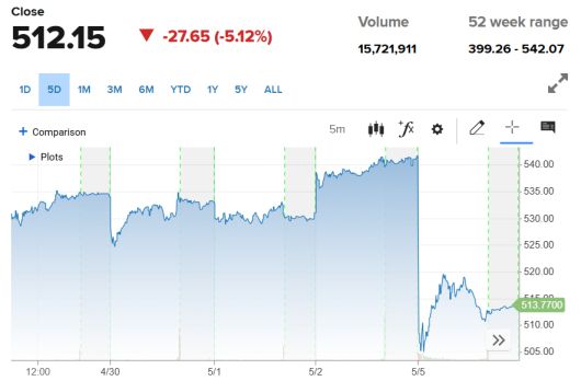 버크셔해서웨이 주가 추이. 5일(현지시간) 종가 512.15달러. 출처 CNBC |