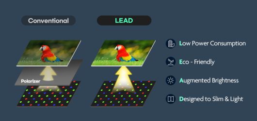 ‘LEADTM’은 삼성디스플레이가 2021년 세계 최초로 상용화한 기술로, OLED 패널에서 외부광 반사 억제 기능을 내재화해 편광판을 제거하면서 휘도 향상과 소비전력 절감을 동시에 구현한 것이 특징이다. 처음에는 폴더블 스마트폰에 적용됐으며 이후 바(bar) 타입 스마트폰과 IT 제품으로 적용 범위를 확대하고 있다.