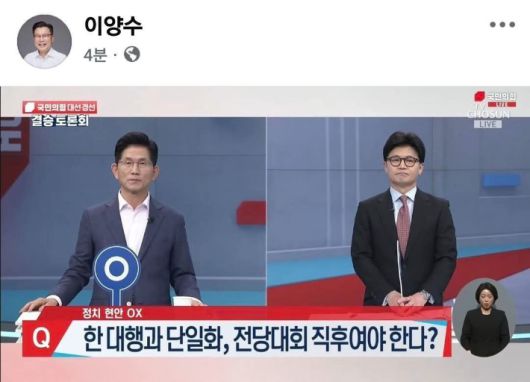 ◇ 김현정> 그 발언이 이양수 사무총장이 어제 올린 SNS를 보면 바로 알 수 있는데 이거거든요. 이게 뭐냐 하면 지난 최종 토론 때 김문수, 한동훈 두 후보 간의 최종 토론 때 질문이 나왔었어요. 한 대행과의 단일화, 전당대회 직후여야 한다. O, X. 그거 한번 보고 올까요? 화면 있습니까? 보고 오겠습니다.