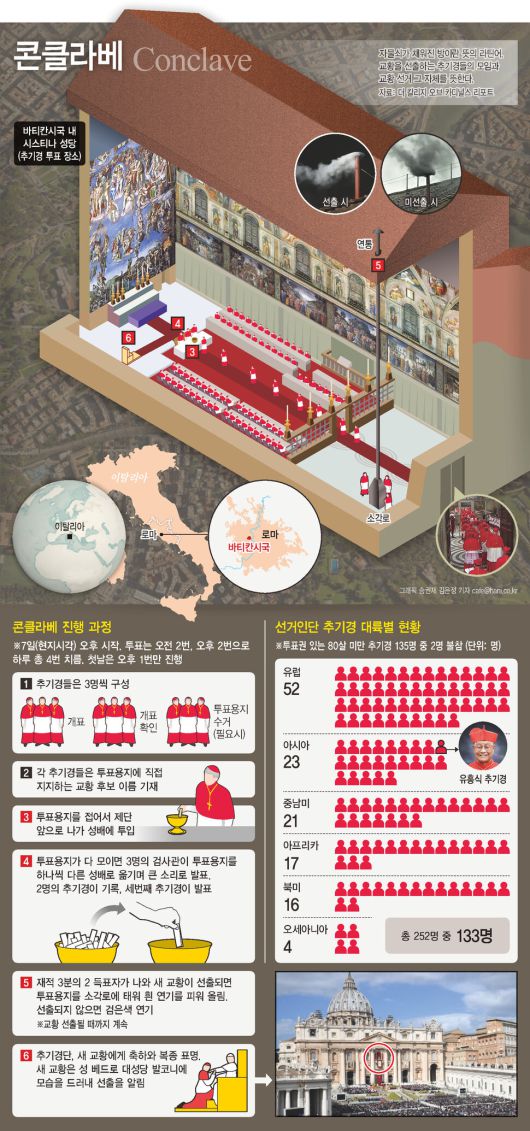 7일 오후 바티칸 시스티나 성당에서 시작되는 콘클라베는 추기경 선거인단의 3분의 2 이상인 최소 89명의 지지를 얻은 추기경이 교황으로 선출될 때까지 계속된다. 첫날엔 오후 4시30분 한번만 투표를 하고, 이후엔 매일 오전과 오후에 두번씩, 최대 네번 투표를 진행한다. 투표 결과는 시스티나 성당 위에 설치된 굴뚝의 연기 색깔을 통해 알 수 있다. 교황이 선출되면 흰 연기가 피어오르지만 그렇지 않을 경우 검은 연기가 올라온다. 이 과정을 반복해 다수표를 얻은 교황이 교황직 수락 동의를 하면 콘클라베는 종료된다. 교황 선출 과정의 모든 내용을 비밀로 지킨다는 비밀 엄수 서약을 한 추기경들은 외부와 완전히 차단된 채 투표를 진행한다. 교황청은 콘클라베 첫 투표를 진행하기 1시간 반 전부터 바티칸시국 안에 설치된 휴대전화 통신 신호 전송 시스템을 비활성화하기로 하는 등 보안 유지에 총력을 기울이고 있다.