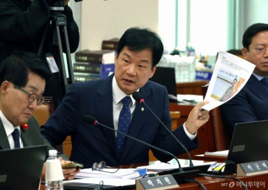 [서울=뉴시스] 고승민 기자 = 박균택 더불어민주당 의원이 21일 서울 여의도 국회에서 열린 법제사법위원회의 대검찰청 국정감사에서 명태균 씨 관련 기사를 들고 질의하고 있다. 2024.10.21. kkssmm99@newsis.com /사진=고승민 |