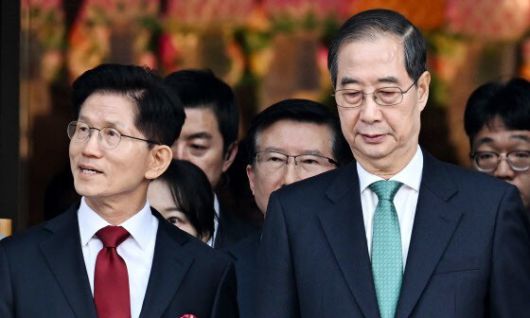 김문수 국민의힘 대통령 후보(왼쪽)와 한덕수 무소속 후보가 5일 서울 종로구 조계사에서 봉축법요식에 입장하고 있다. 연합뉴스 |