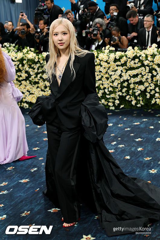 4년 만에 멧 갈라에 등장한 로제는 롱 헤어와 깊게 파인 블랙 수트를 입고, 귀걸이와 목걸이 등 화려한 액세서리로 고급스러움을 강조했다. 그녀의 차분하면서도 강렬한 매력은 멧 갈라를 빛냈다.