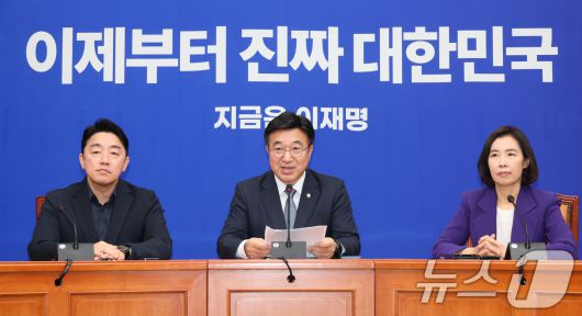 윤호중 더불어민주당 총괄선거대책본부장이 5일 오전 서울 여의도 국회에서 열린 기자간담회에 참석해 모두 발언하고 있다. 왼쪽부터 강훈식 수석부본부장, 윤 본부장, 박경미 대변인. 2025.5.5/뉴스1 ⓒ News1 안은나 기자 |