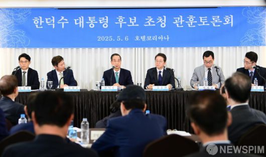 [서울=뉴스핌] 국회사진취재단 = 한덕수 무소속 대통령선거 예비후보가 6일 오전 서울 중구 코리아나 호텔에서 열린 관훈토론회에 참석해 기조연설을 하고 있다. 2025.05.06 photo@newspim.com