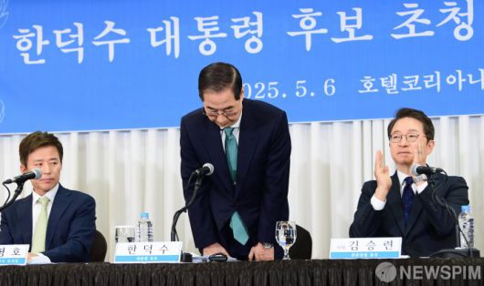 [서울=뉴스핌] 국회사진취재단 = 한덕수 무소속 대통령선거 예비후보가 6일 오전 서울 중구 코리아나 호텔에서 열린 관훈토론회에 참석해 인사하고 있다. 2025.05.06 photo@newspim.com |