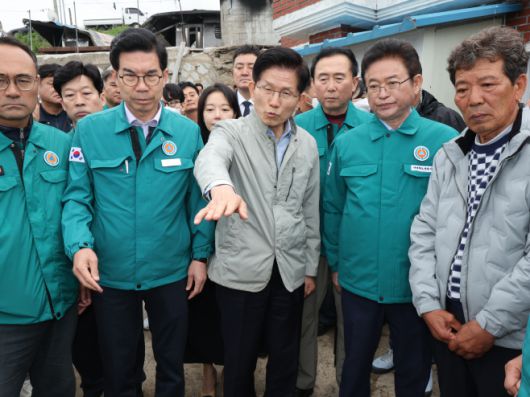 국민의힘 김문수 대선 후보가 6일 대형 산불 피해를 입은 경북 영덕군 영덕읍 석리 따개비마을을 방문해 복구 현황을 살펴보고 있다./연합뉴스 |