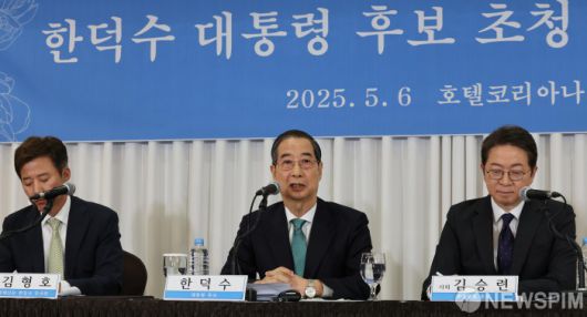 [서울=뉴스핌] 국회사진취재단 = 한덕수 무소속 대통령선거 예비후보가 6일 오전 서울 중구 코리아나 호텔에서 열린 관훈토론회에 참석해 기조연설을 하고 있다. 2025.05.06 photo@newspim.com