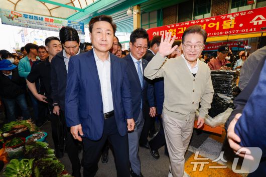(증평=뉴스1) 안은나 기자 = 이재명 더불어민주당 대통령 후보가 골목골목 경청투어 이틀차를 맞은 6일 오전 충북 증평군 장뜰시장을 찾아 인사하고 있다. 2025.5.6/뉴스1coinlocker@news1.krCopyright ⓒ 뉴스1. All rights reserved. 무단 전재 및 재배포, AI학습 이용 금지.